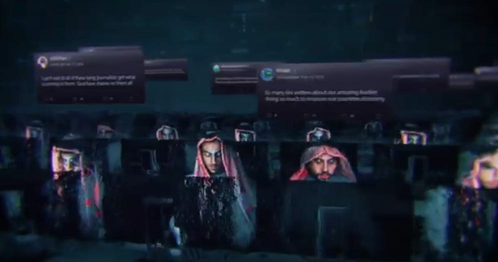 More recently still, I did a review of The Dissident, the 2020 documentary that provides an insider’s look at the targeting and death of Jamal Khoshoggi. The review is titled “MBS: Lord of the Flies,” because, according to director Brian Fogle, that is what MBS sets up -- a dark room full of spooky dishdashed men who spend all their hours attacking a target online, unleashing insults and promising death. Khashoggi, who had crossed the line from being a columnist at WaPo, to a dissident (illegal in the Kingdom, according to Saudi sources in the film), was targeted by these so-called Flies, who swarmed him before he was “taken” at the Saudi embassy in Istanbul. Check it out.
