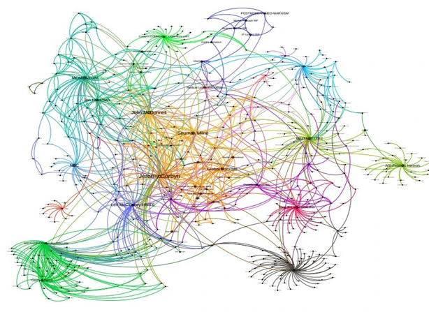 In the above graphic, all of Corbyn’s “connections” are purportedly shown. Zoom in to see how comprehensive it is, remembering that behind the dots you see are other connections. You can get this kind of data image from many database graphic-analyzing tools. But most likely you’d hire a company like CA or, in America, like Recorded Future. What’s accidently scary about such graphs is that they show YOU in a potential swarm against another, attack streams, and the target a 3D theatre -- but also, gulp, what you’d be up against if you were the target of a swarm. One panics: I remember a childhood stupidity where I meanly put my shoe over a yellow jacket hole in the ground, when it suddenly occurred to me I’d have to get off the hole -- and when I did: ZOWIE. Ouch!